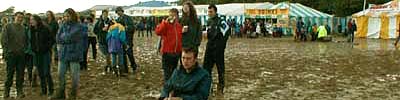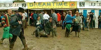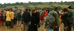 NB: The use of the word 'we' throughout refers to a varying group. It's rare to do anything at Glastonbury on your own. We'd already heard stories about how they'd nearly cancelled Glastonbury two or three weeks ago because the ground was so waterlogged. They'd been pumping out the area round the Pyramid Stage to make it stable enough to even put the thing up. Oh shit. It was always going to be a muddy one.A really strong flu thing's been doing the rounds in Leeds, and me and Annwen were both on the tag-end of it at Avebury for solstice. We chilled out with some friends in Bristol, and finally went to Glastonbury on Thursday. We'd wanted to go Tuesday, but the rain and the snot were enough to keep us in comfy duvet-land. Bristol to the festival in one lift, no hassle. We started walking round the perimeter, and were swamped with people selling the UV stamp that ticket-holders get as a pass-out (starting price: £20, easily haggled to a tenner). They stamp you and come in with you, and only when you're in do you actually pay them, so there's no chance of a rip off. We were doing the whole thing on about forty quid for the two of us, so we thought we'd walk around a bit. The fence around the site is ten feet high and made of sheet steel. On the other side is a five yard gap and then one of those fences you see round building sites: 6 foot high wire grilles with tube frames standing in concrete blocks. The gap between the two fences is patrolled by security guards. There were several people selling the use of their rope ladders to get over the fence for a tenner a go. We haggled one lot down to a tenner for the both of us and went for it. There were three security guards on the other side of the fence, but the guys with the rope said they'd paid them off. I went up, threw the bags over, and jumped. Annwen took a while, she got even scareder than me at the top of the fence, then she jumped. |